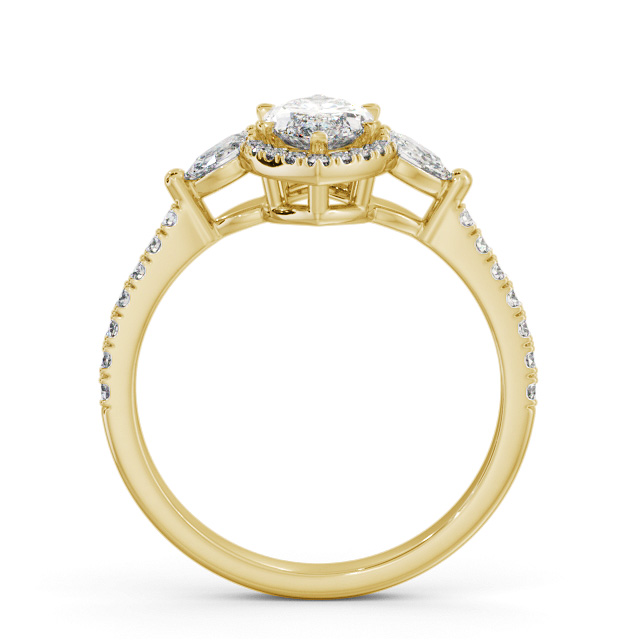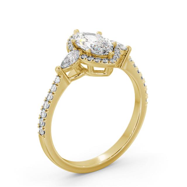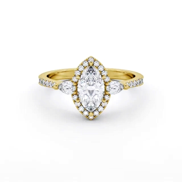 Lanaya diamond engagement ring with a halo 18K Yellow Gold setting. Trendy with a vintage appeal, a gorgeous marquise shaped centre diamond surrounded in a halo of small round diamonds, two equally dazzling pear shaped diamonds and additional round diamond embedded shoulders completes this alluring engagement ring. Smaller diamonds will be of VS1 Clarity and F Colour as standard. This ring is available in a range of metal options and your choice of natural or lab grown diamonds. We offer a free design service for any customised changes that you may require.