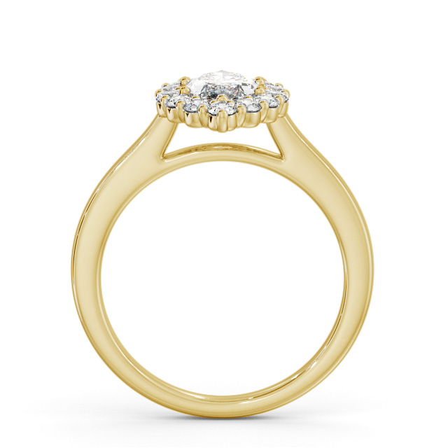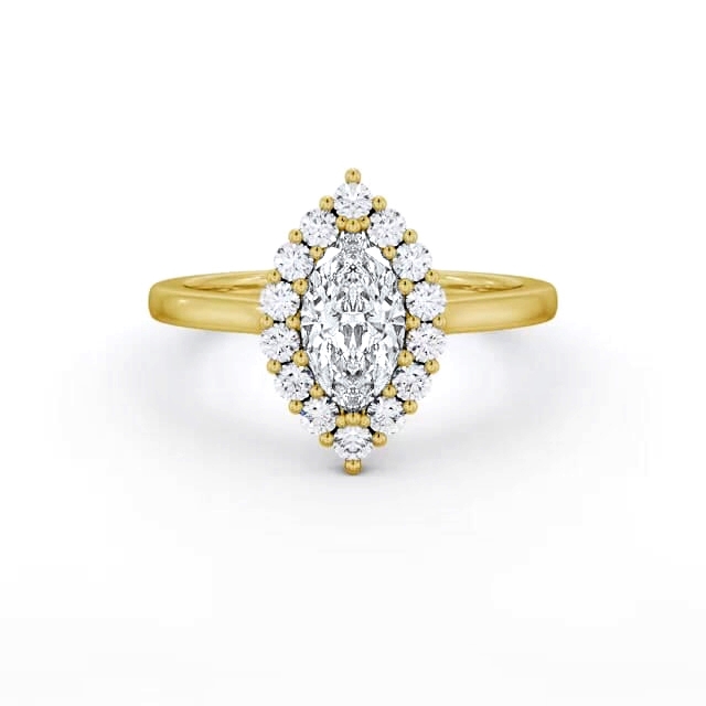Sarene diamond engagement ring with a halo 18K Yellow Gold setting. A marquise shaped centre diamond is passionately embraced by a gleaming array of small round diamonds in this highly polished engagement ring. Smaller diamonds will be of VS1 Clarity and F Colour as standard. This ring is available in a range of metal options and your choice of natural or lab grown diamonds. We offer a free design service for any customised changes that you may require.