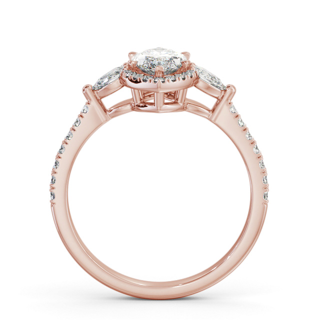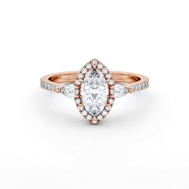 Lanaya diamond engagement ring with a halo 9K Rose Gold setting. Trendy with a vintage appeal, a gorgeous marquise shaped centre diamond surrounded in a halo of small round diamonds, two equally dazzling pear shaped diamonds and additional round diamond embedded shoulders completes this alluring engagement ring. Smaller diamonds will be of VS1 Clarity and F Colour as standard. This ring is available in a range of metal options and your choice of natural or lab grown diamonds. We offer a free design service for any customised changes that you may require.
