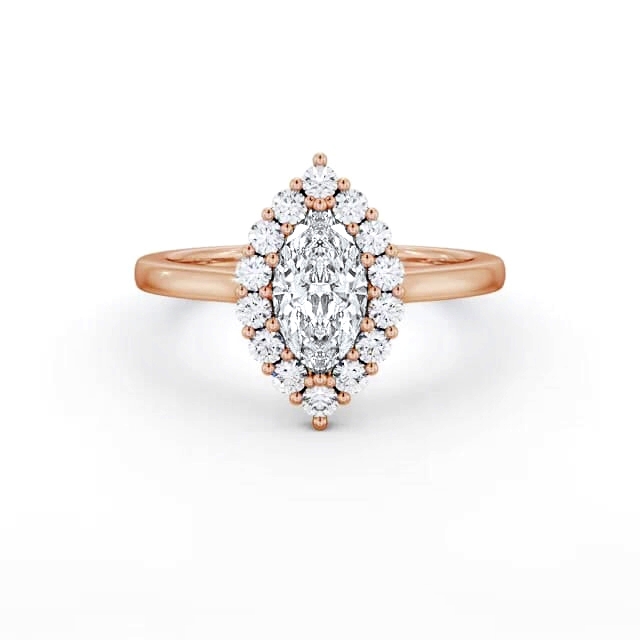 Sarene diamond engagement ring with a halo 9K Rose Gold setting. A marquise shaped centre diamond is passionately embraced by a gleaming array of small round diamonds in this highly polished engagement ring. Smaller diamonds will be of VS1 Clarity and F Colour as standard. This ring is available in a range of metal options and your choice of natural or lab grown diamonds. We offer a free design service for any customised changes that you may require.
