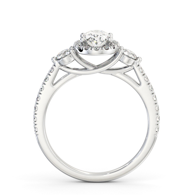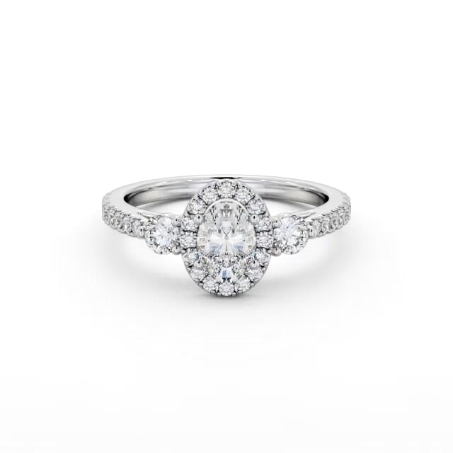 Josey diamond engagement ring with a halo 18K White Gold setting. This modern engagement ring features an oval shaped centre diamond accented by a halo of small round diamonds, a round shaped diamond set on each side, and a round diamond studded band. Smaller diamonds will be of VS1 Clarity and F Colour as standard. This ring is available in a range of metal options and your choice of natural or lab grown diamonds. We offer a free design service for any customised changes that you may require.