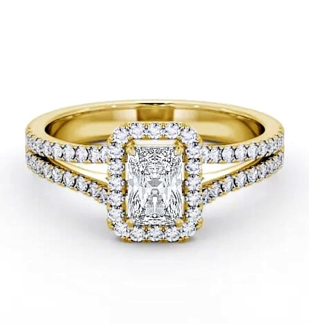 Ivonne diamond engagement ring with a halo 18K Yellow Gold setting. Gorgeous and elegant, this ring displays a prong set oval shaped diamond, surrounded by small round shape diamonds which continue down each side of the bandSmaller diamonds will be of VS1 Clarity and F Colour as standard. This ring is available in a range of metal options and your choice of natural or lab grown diamonds. We offer a free design service for any customised changes that you may require.