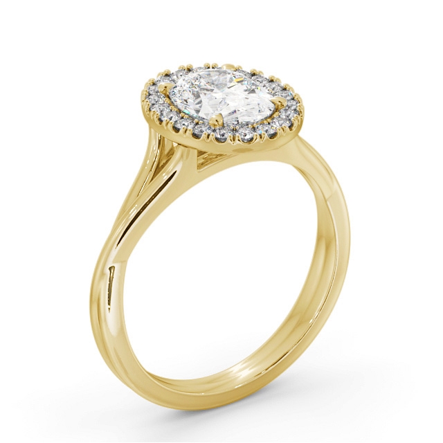 Arianne diamond engagement ring with a halo 9K Yellow Gold setting. Effortless elegance, this classic ring features a stunning oval shaped diamond framed by a halo of smaller round diamonds. A highly polished split band adds extra charm. Smaller diamonds will be of VS1 Clarity and F Colour as standard. This ring is available in a range of metal options and your choice of natural or lab grown diamonds. We offer a free design service for any customised changes that you may require.