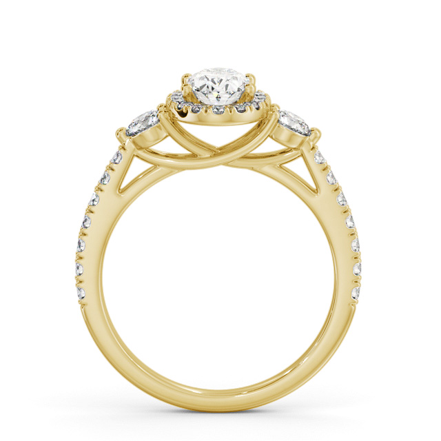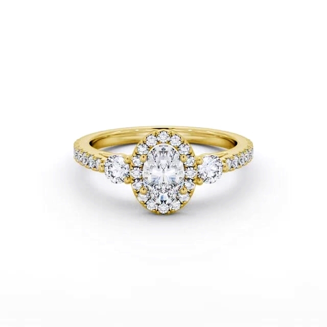 Josey diamond engagement ring with a halo 9K Yellow Gold setting. This modern engagement ring features an oval shaped centre diamond accented by a halo of small round diamonds, a round shaped diamond set on each side, and a round diamond studded band. Smaller diamonds will be of VS1 Clarity and F Colour as standard. This ring is available in a range of metal options and your choice of natural or lab grown diamonds. We offer a free design service for any customised changes that you may require.