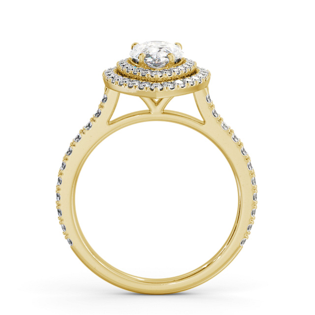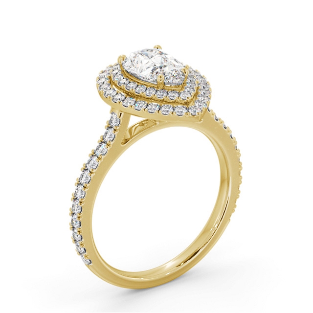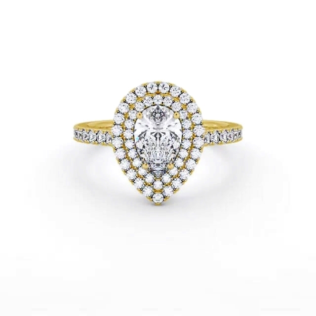 Aniya diamond engagement ring with a halo 18K Yellow Gold setting. Stunning in every way, this ring flaunts shimmering pear shaped diamond encircled by a double frame of smaller round diamonds and additional diamonds adorned band. Smaller diamonds will be of VS1 Clarity and F Colour as standard. This ring is available in a range of metal options and your choice of natural or lab grown diamonds. We offer a free design service for any customised changes that you may require.