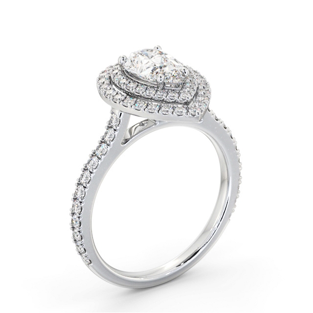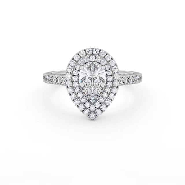 Aniya diamond engagement ring with a halo Palladium setting. Stunning in every way, this ring flaunts shimmering pear shaped diamond encircled by a double frame of smaller round diamonds and additional diamonds adorned band. Smaller diamonds will be of VS1 Clarity and F Colour as standard. This ring is available in a range of metal options and your choice of natural or lab grown diamonds. We offer a free design service for any customised changes that you may require.