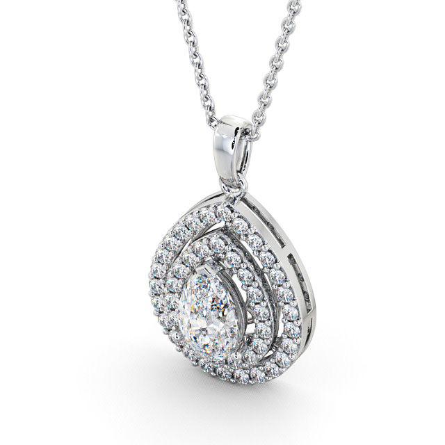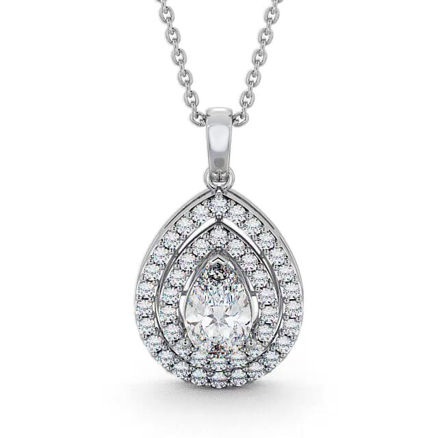Marta halo diamond pendant in 18K White Gold. Truly extraordinary, this pendant features a pear shaped centre diamond framed by a double halo of round diamonds in an elegant drop design. Smaller round halo diamonds will be of standard quality VS1 Clarity and F Colour. This pendant is available in a range of metal and chain options with your choice of natural or lab grown diamonds. We offer a free design service for any customised changes that you may require.