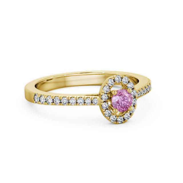 Charlene halo pink sapphire and diamond 0.36ct ring in a 18K Yellow Gold setting. Glimmering round diamonds encircle a 0.20 Carat round shaped pink sapphire centre stone in an oval frame, and adorn each side of the ring for a luminous appeal. Total diamonds weighs 0.16 Carat. This ring is available in a range of metal options with AAA grade gemstone. We offer a free design service for any customised changes that you may require.