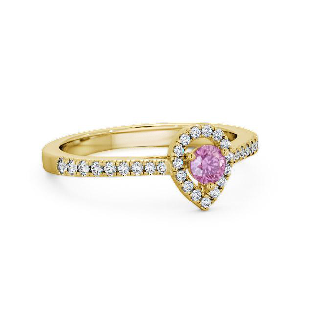 Rivka halo pink sapphire and diamond 0.37ct ring in a 9K Yellow Gold setting. This gorgeous ring glitter with a 0.20 Carat central round pink sapphire gemstone framed by a pear shaped halo of sparkling round diamonds and additional diamond-lined shank. Diamond weighs 0.17 Carat total weight. This ring is available in a range of metal options with AAA grade gemstone. We offer a free design service for any customised changes that you may require.