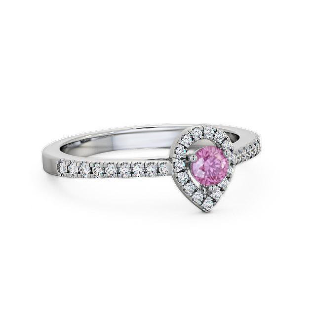 Rivka halo pink sapphire and diamond 0.37ct ring in a Platinum setting. This gorgeous ring glitter with a 0.20 Carat central round pink sapphire gemstone framed by a pear shaped halo of sparkling round diamonds and additional diamond-lined shank. Diamond weighs 0.17 Carat total weight. This ring is available in a range of metal options with AAA grade gemstone. We offer a free design service for any customised changes that you may require.