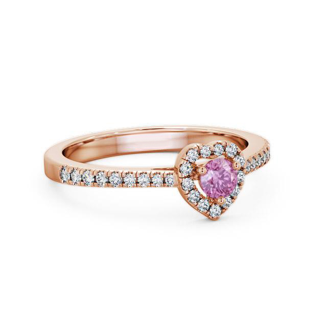 Adia halo pink sapphire and diamond 0.50ct ring in a 9K Rose Gold setting. Truly romantic, a beautiful 0.34 Carat round shaped pink sapphire gemstone is haloed by a heart frame of sparkling round diamonds at the top and a channel of shoulder diamonds on either side of the ring. Total diamonds weighs 0.16 Carat. This ring is available in a range of metal options with AAA grade gemstone. We offer a free design service for any customised changes that you may require.
