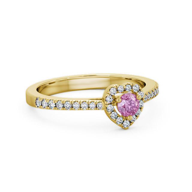 Adia halo pink sapphire and diamond 0.50ct ring in a 9K Yellow Gold setting. Truly romantic, a beautiful 0.34 Carat round shaped pink sapphire gemstone is haloed by a heart frame of sparkling round diamonds at the top and a channel of shoulder diamonds on either side of the ring. Total diamonds weighs 0.16 Carat. This ring is available in a range of metal options with AAA grade gemstone. We offer a free design service for any customised changes that you may require.