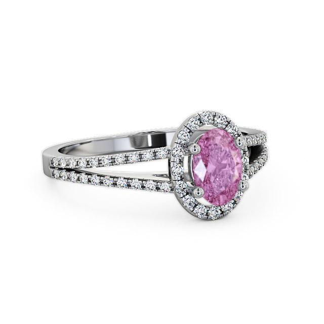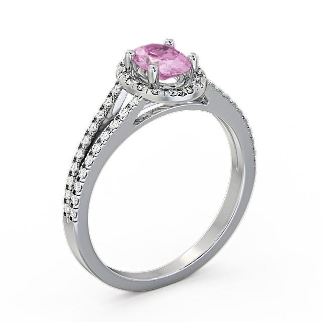 Jailah halo pink sapphire and diamond 0.86ct ring in a 18K White Gold setting. Classic and impressive, this gorgeous ring showcases a single 0.60 Carat oval-cut pink sapphire in the centre, along with sparkling 0.26 Carat total weight of round diamonds on the halo and each split design shoulder. This ring is available in a range of metal options with AAA grade gemstone. We offer a free design service for any customised changes that you may require.