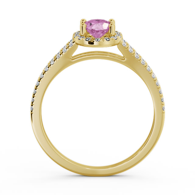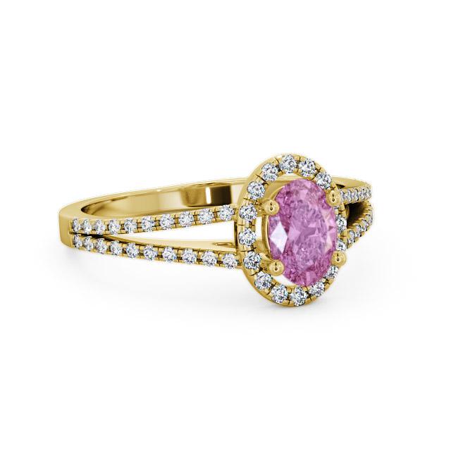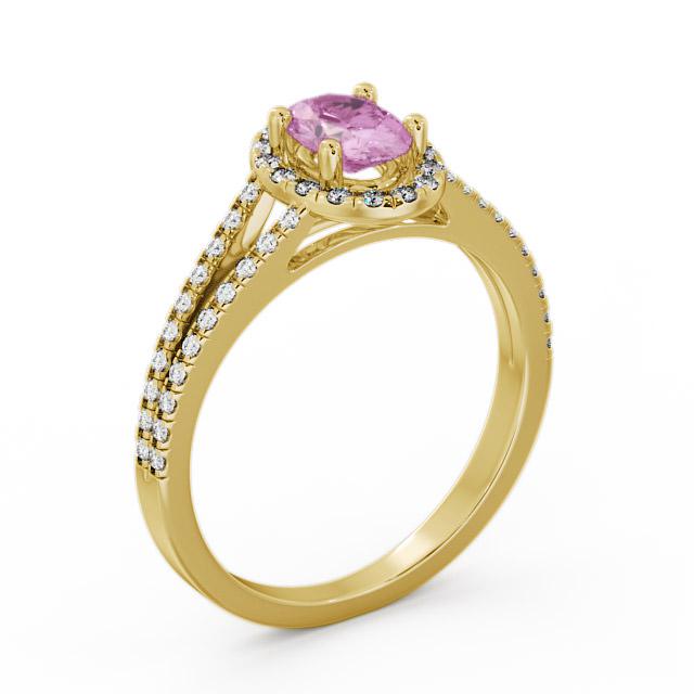 Jailah halo pink sapphire and diamond 0.86ct ring in a 9K Yellow Gold setting. Classic and impressive, this gorgeous ring showcases a single 0.60 Carat oval-cut pink sapphire in the centre, along with sparkling 0.26 Carat total weight of round diamonds on the halo and each split design shoulder. This ring is available in a range of metal options with AAA grade gemstone. We offer a free design service for any customised changes that you may require.