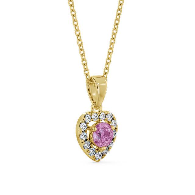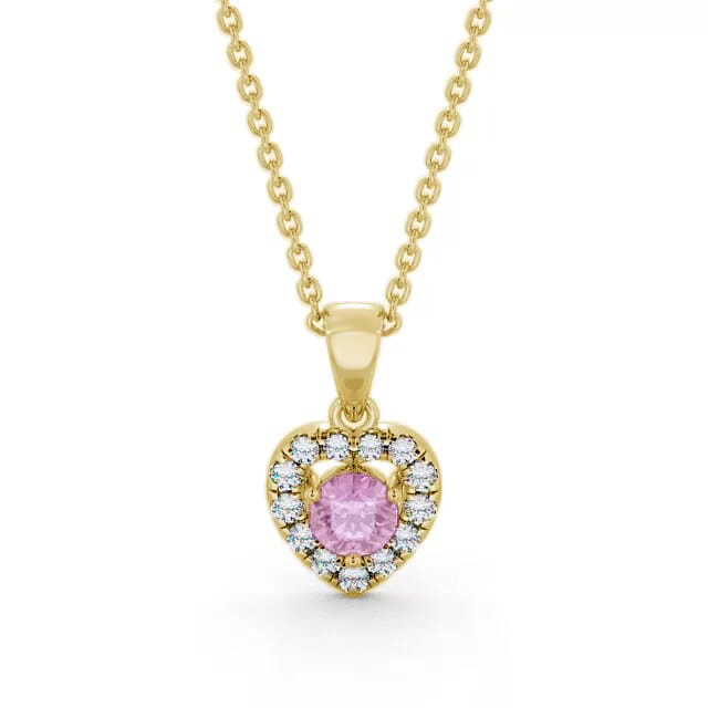 Sakina halo pink sapphire and diamond 0.90ct pendant in a 18K Yellow Gold setting. Romantically delightful, this heart design pendant features a 0.65 Carat round-shaped pink sapphire gemstone highlighted by a glimmering halo of glistening 0.25 Carat total weight of round diamonds. The pendant is available in a range of metal and chain options with AAA grade gemstones. We offer a free design service for any customised changes that you may require.