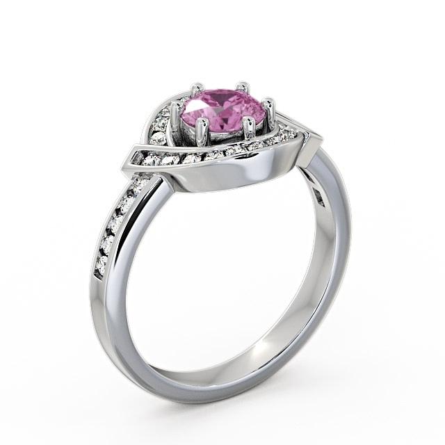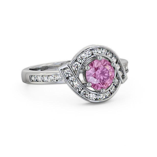Lenna halo pink sapphire and diamond 0.91ct ring in a Palladium setting. This designer ring boasts a stunning 0.65 Carat round pink sapphire gemstone in the centre encircled by channel set sparkling round diamonds. Additional round diamonds flow down on either side of the shank, total diamonds weighs 0.26 Carat. This ring is available in a range of metal options with AAA grade gemstone. We offer a free design service for any customised changes that you may require.