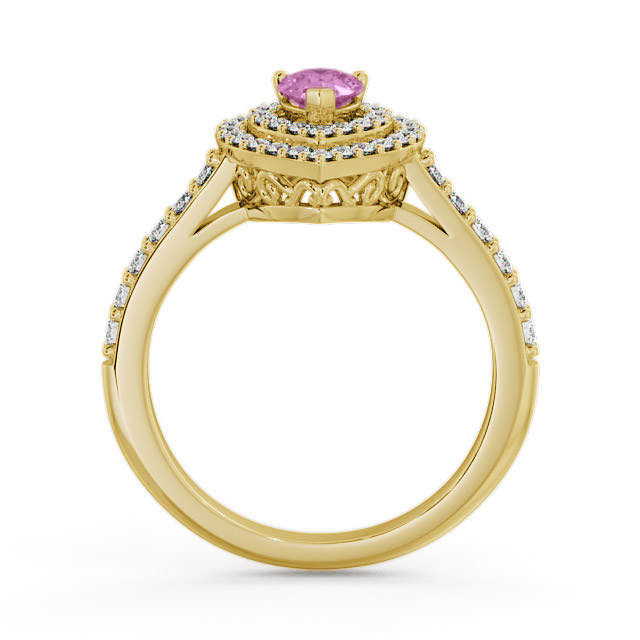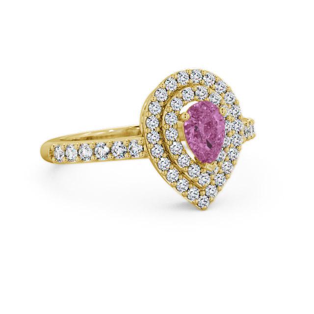 Tracy halo pink sapphire and diamond 0.97ct ring in a 9K Yellow Gold setting. This delightful ring features a beautiful 0.50 Carat pear shaped pink sapphire in the centre framed by 0.47 Carat total weight of round diamonds on a double halo and down each shoulders. This ring is available in a range of metal options with AAA grade gemstone. We offer a free design service for any customised changes that you may require.