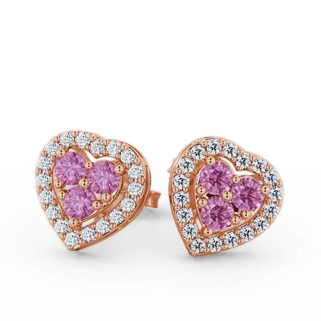 Esabella halo pink sapphire and diamond 1.26ct earrings in a 9K Rose Gold setting. Romantic and full of sparkle, each of these heart earring features three round pink sapphire gemstones at the centre, majestically hugged by sparkling round diamonds. Sapphires weighs 0.90 Carat total weight and diamonds weighs 0.36 Carat total weight. The total Carat weight is based on per pair. These earrings are available in a range of metal options with AAA grade gemstone. We offer a free design service for any customised changes that you may require.