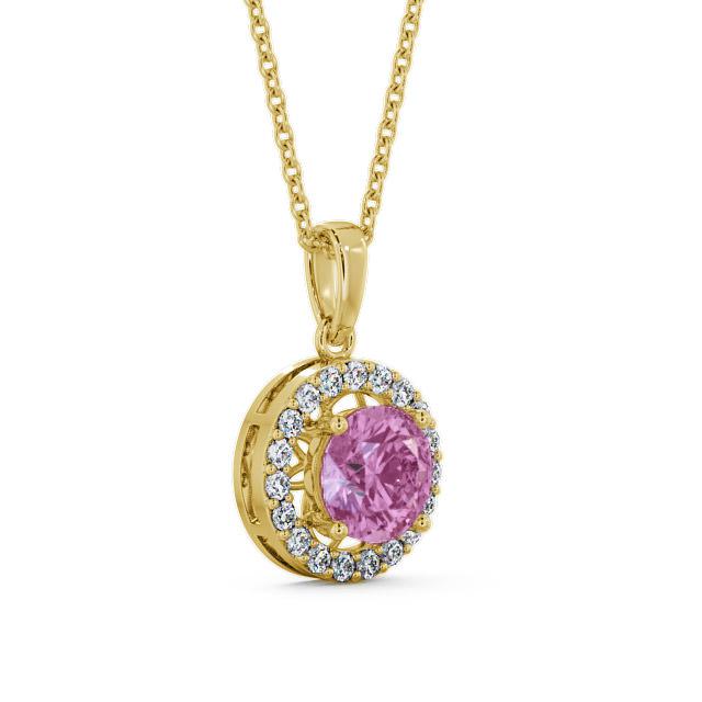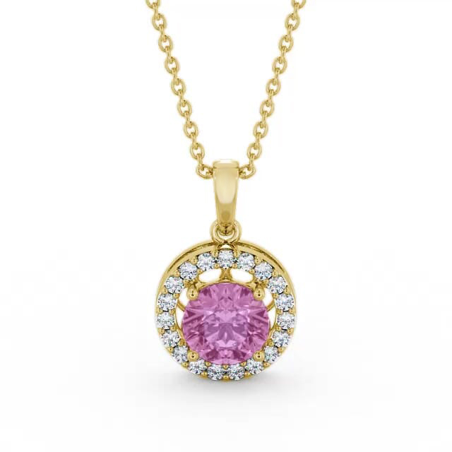 Natalie halo pink sapphire and diamond 1.43ct pendant in a 18K Yellow Gold setting. Simple and elegant, this solitaire pendant features a 1.05 Carat round pink sapphire illuminated by a sparkling halo of 0.38 Carat round diamonds. The pendant is available in a range of metal and chain options with AAA grade gemstones. We offer a free design service for any customised changes that you may require.