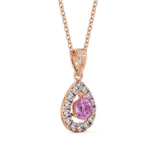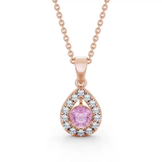 Milana halo pink sapphire and diamond 1.47ct pendant in a 18K Rose Gold setting. Exquisitely elegant, this drop pendant showcases a 1.05 Carat round-shaped pink sapphire gemstone wrapped in a pear-shaped frame of 0.42 Carat round diamonds. The pendant is available in a range of metal and chain options with AAA grade gemstone. We offer a free design service for any customised changes that you may require.