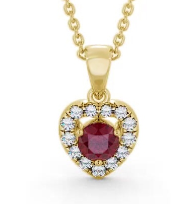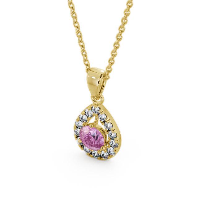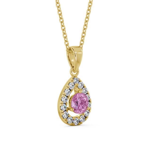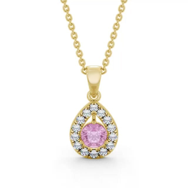 Milana halo pink sapphire and diamond 1.47ct pendant in a 18K Yellow Gold setting. Exquisitely elegant, this drop pendant showcases a 1.05 Carat round-shaped pink sapphire gemstone wrapped in a pear-shaped frame of 0.42 Carat round diamonds. The pendant is available in a range of metal and chain options with AAA grade gemstone. We offer a free design service for any customised changes that you may require.