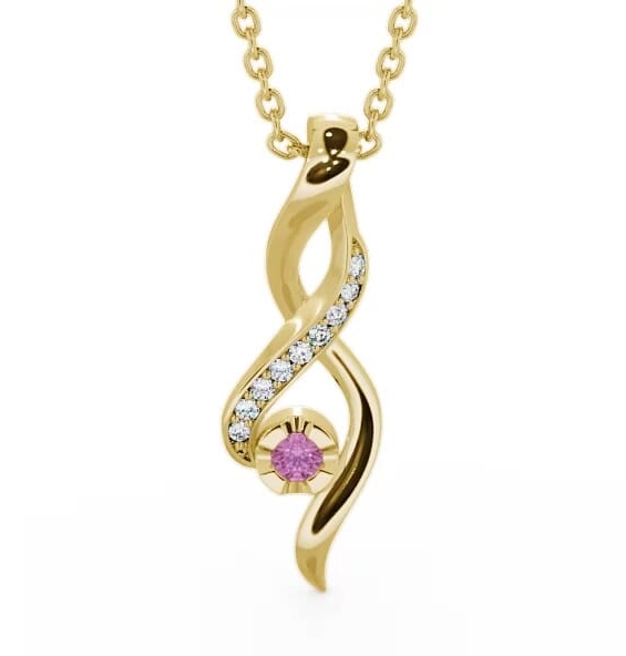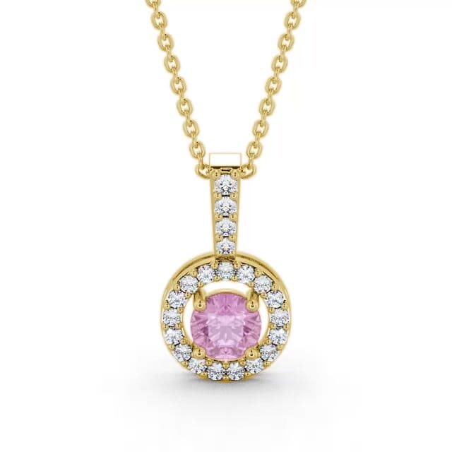 Kyrie halo pink sapphire and diamond 1.50ct pendant in a 18K Yellow Gold setting. Simple and elegant, this exquisite pendant depicts a 1.05 Carat round pink sapphire gemstone in the centre illuminated by a charming halo of round diamonds. Additional diamond-lined bail provides extra shine. Total diamonds weighs 0.45 Carat. The pendant is available in a range of metal and chain options with AAA grade gemstone. We offer a free design service for any customised changes that you may require.