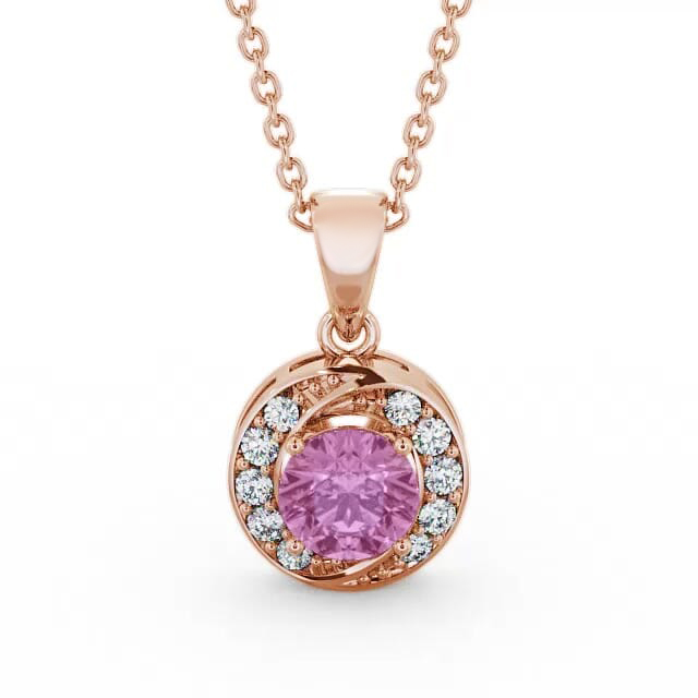 Kamri halo pink sapphire and diamond 1.61ct pendant in a 18K Rose Gold setting. Shimmering with style, this alluring pendant showcases a 1.41 Carat round pink sapphire wrapped in 0.20ct of round diamonds. The pendant is available in a range of metal and chain options with AAA grade gemstones. We offer a free design service for any customised changes that you may require.