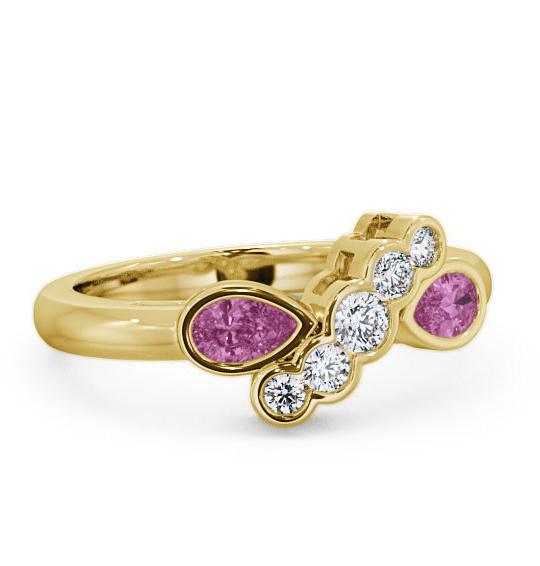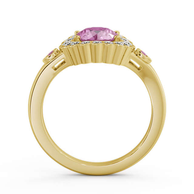 Emmalin halo pink sapphire and diamond 1.69ct ring in a 9K Yellow Gold setting. Impressive and classy, this lovely ring exhibits a round pink sapphire gemstone in the centre haloed by bezel set round diamonds with a 0.24 Carat total weight. This ring also has one round pink sapphire on either side. Total pink sapphire gemstones weighs 1.45 Carat. This ring is available in a range of metal options with AAA grade gemstone. We offer a free design service for any customised changes that you may require.