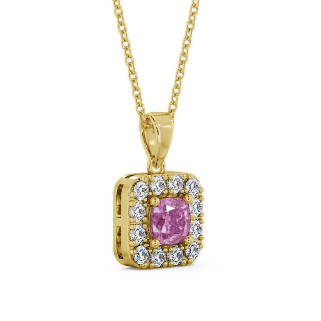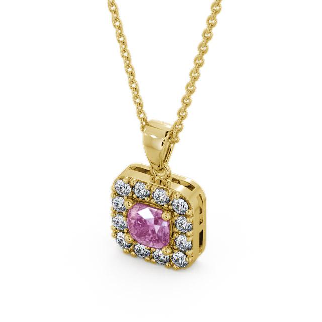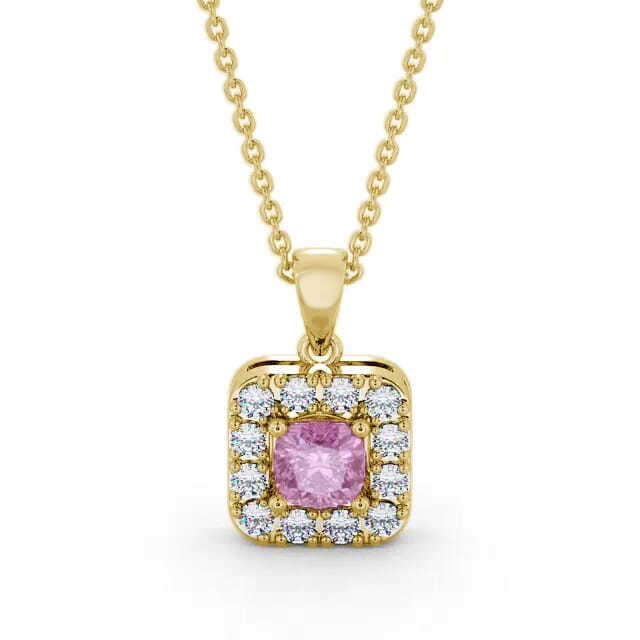 Kensie halo pink sapphire and diamond 1.90ct pendant in a 18K Yellow Gold setting. Elegant and exquisite, this pendant showcases a stunning 1.30 Carat cushion-cut pink sapphire gemstone encircled by sparkling 0.60 Carat total weight of round diamonds. The pendant is available in a range of metal and chain options with AAA grade gemstones. We offer a free design service for any customised changes that you may require.