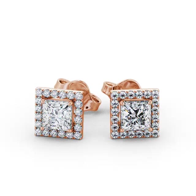 Delores halo diamond earrings in 9K Rose Gold. These alluring stud earrings boast a princess shaped centre diamond wrapped in square-shaped frame of shimmering round diamonds. Smaller round diamonds will be of VS1 Clarity and F Colour as standard and total diamond weight is based on per pair. These earrings are available in a range of metal options and your choice of natural or lab grown diamonds. We offer a free design service for any customised changes that you may require.