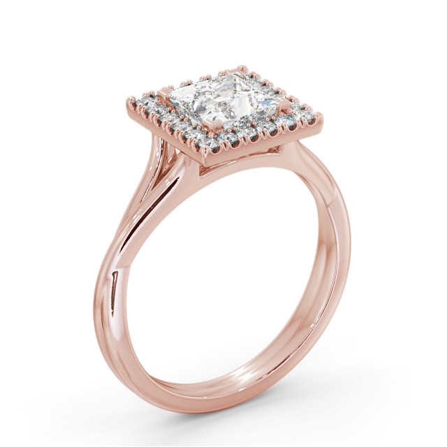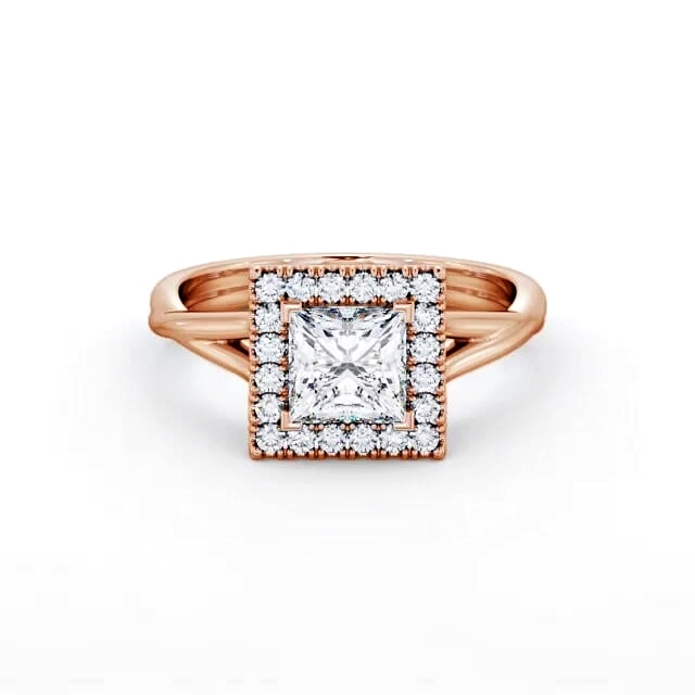 Billie diamond engagement ring with a halo 18K Rose Gold setting. This stylish ring presents a princess shaped diamond artfully set at the centre, well complemented by a halo frame of small round diamonds with split design shoulders. Smaller diamonds will be of VS1 Clarity and F Colour as standard. This ring is available in a range of metal options and your choice of natural or lab grown diamonds. We offer a free design service for any customised changes that you may require.