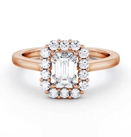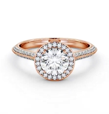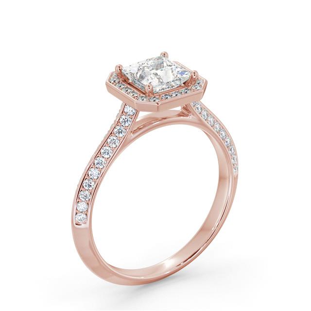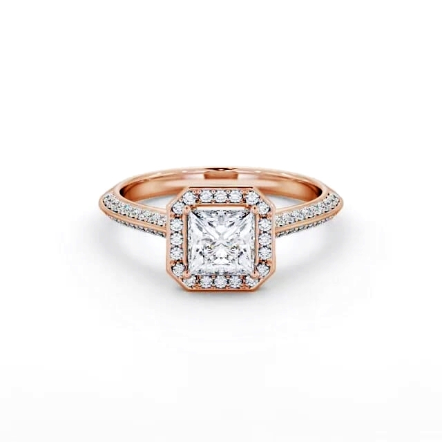 Freya diamond engagement ring with a halo 18K Rose Gold setting. Unique and contemporary style, a large princess shaped centre diamond is framed by a halo of small round diamonds that run along the knife edge band as well. Smaller diamonds will be of VS1 Clarity and F Colour as standard. This ring is available in a range of metal options and your choice of natural or lab grown diamonds. We offer a free design service for any customised changes that you may require.