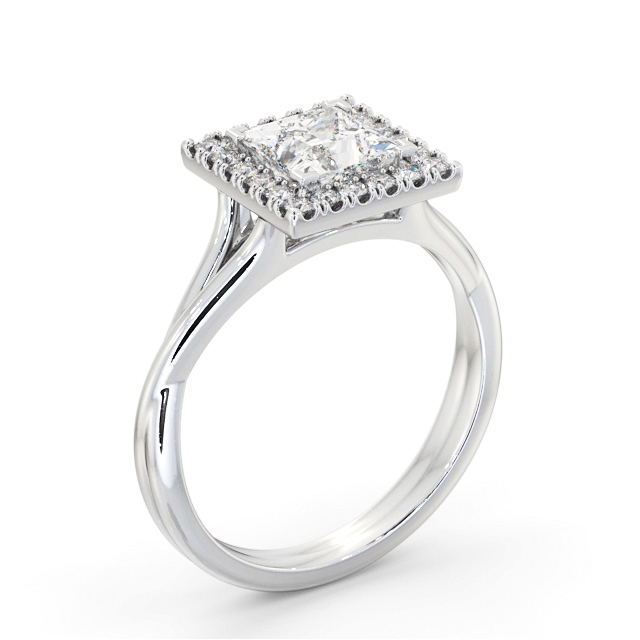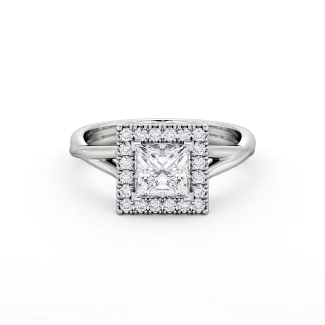 Billie diamond engagement ring with a halo 18K White Gold setting. This stylish ring presents a princess shaped diamond artfully set at the centre, well complemented by a halo frame of small round diamonds with split design shoulders. Smaller diamonds will be of VS1 Clarity and F Colour as standard. This ring is available in a range of metal options and your choice of natural or lab grown diamonds. We offer a free design service for any customised changes that you may require.