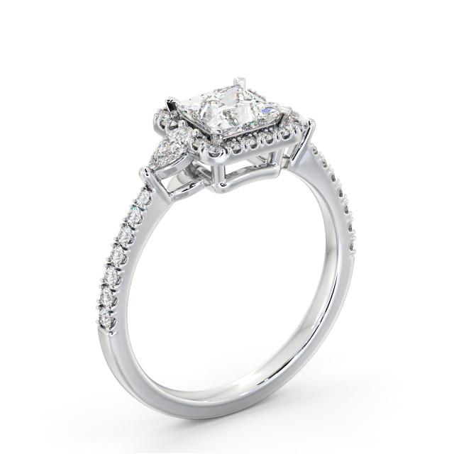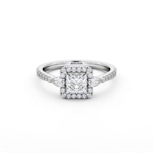 Yurasa diamond engagement ring with a halo 18K White Gold setting. Pretty and delightful ring style, gleaming halo of small round diamonds reveal a princess shaped centre diamond and two pear shaped accents diamonds at the centre along with additional small round diamond embedded sleek band. Smaller diamonds will be of VS1 Clarity and F Colour as standard. This ring is available in a range of metal options and your choice of natural or lab grown diamonds. We offer a free design service for any customised changes that you may require.