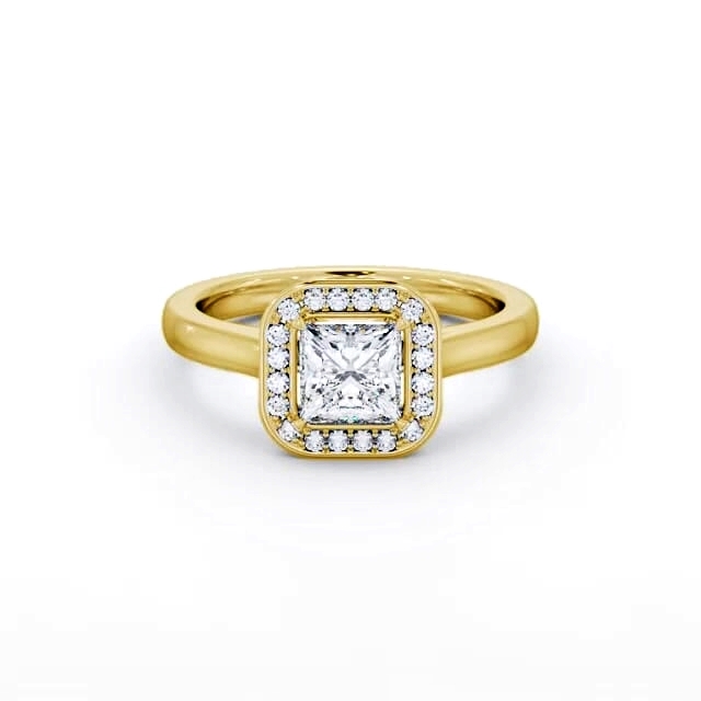 Lucile diamond engagement ring with a halo 18K Yellow Gold setting. Simply alluring, this ageless engagement ring oozes eternal shimmer with a princess shaped centre diamond, surrounded by a halo of small round diamonds and a polished finish band. Smaller diamonds will be of VS1 Clarity and F Colour as standard. This ring is available in a range of metal options and your choice of natural or lab grown diamonds. We offer a free design service for any customised changes that you may require.