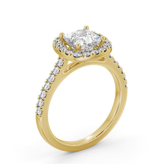 Minka diamond engagement ring with a halo 9K Yellow Gold setting. A splendid design, four prong set princess shaped centre diamond is haloed by small round diamonds for a beautiful look and additional round diamond lined shoulders add radiance to this awe-inspiring ring. Smaller diamonds will be of VS1 Clarity and F Colour as standard. This ring is available in a range of metal options and your choice of natural or lab grown diamonds. We offer a free design service for any customised changes that you may require.