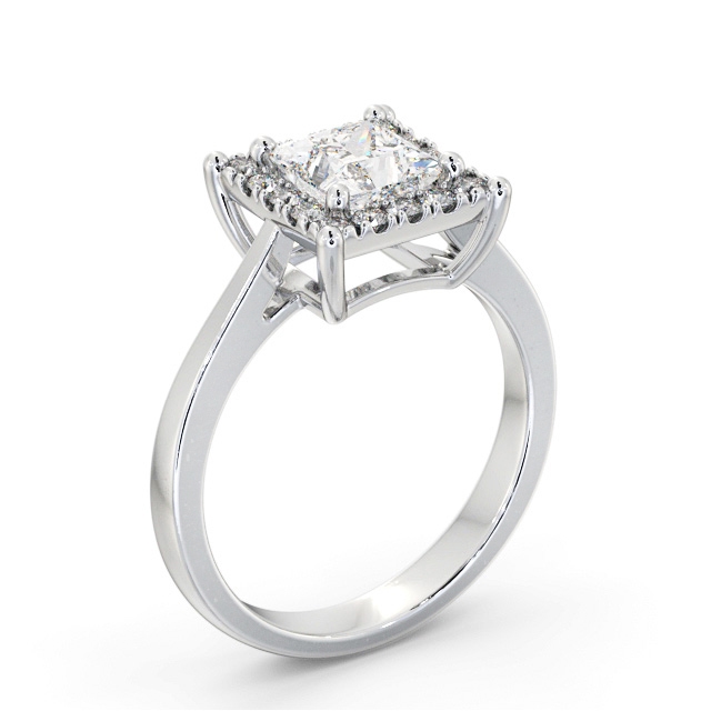 Ahana diamond engagement ring with a halo Platinum setting. This regal style ring features a princess shaped diamond prong set at the centre, precisely framed by smaller round diamonds. Smaller diamonds will be of VS1 Clarity and F Colour as standard. This ring is available in a range of metal options and your choice of natural or lab grown diamonds. We offer a free design service for any customised changes that you may require.