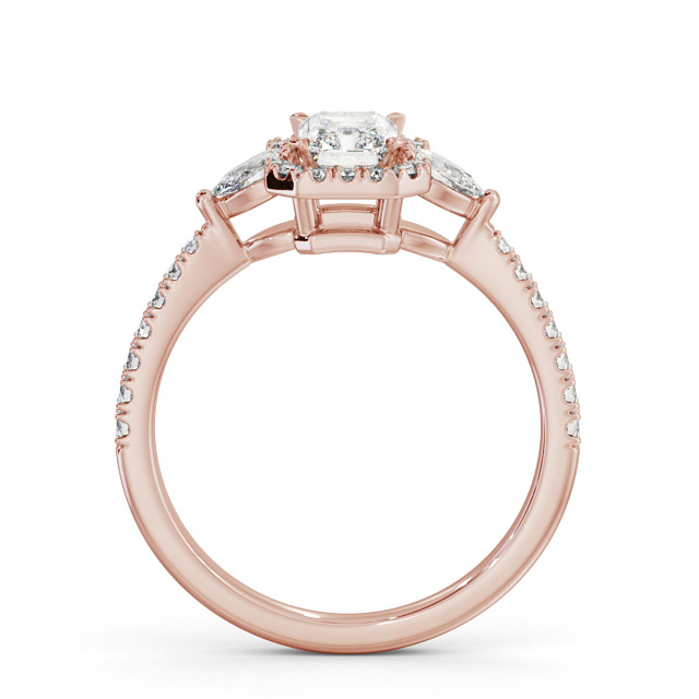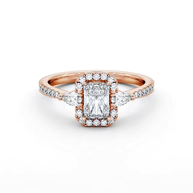 Aries diamond engagement ring with a halo 18K Rose Gold setting. Truly impressive, this exquisite ring features a radiant shaped centre diamond encircled by a halo of small round diamonds and a pear shaped diamond on each side along with a round diamond accented band. Smaller diamonds will be of VS1 Clarity and F Colour as standard. This ring is available in a range of metal options and your choice of natural or lab grown diamonds. We offer a free design service for any customised changes that you may require.