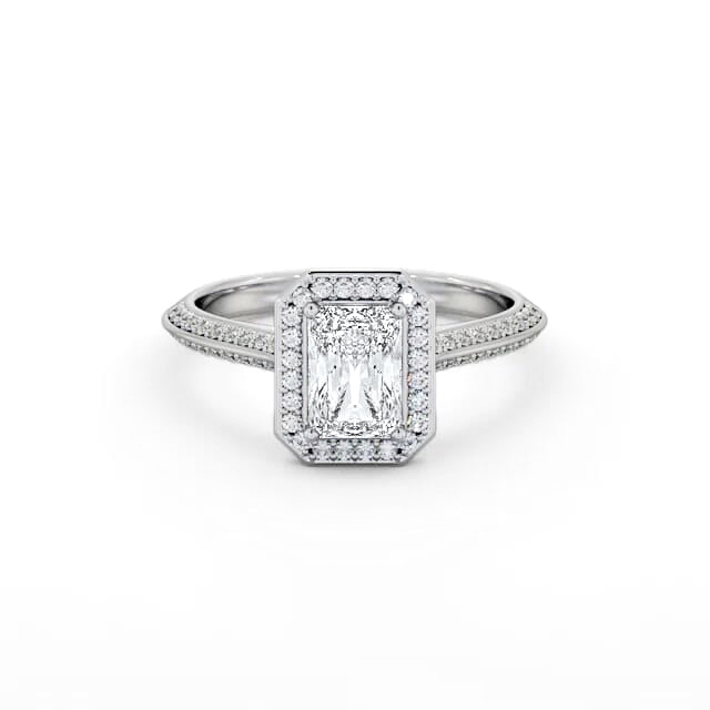 Lamar diamond engagement ring with a halo 18K White Gold setting. This lovely ring shimmers with a genuine radiant shaped centre diamond framed by small round diamonds and additional small round diamonds set on both sides of the knife edge design band. Smaller diamonds will be of VS1 Clarity and F Colour as standard. This ring is available in a range of metal options and your choice of natural or lab grown diamonds. We offer a free design service for any customised changes that you may require.