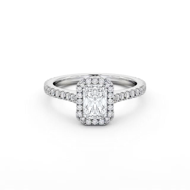 Kittel diamond engagement ring with a halo 9K White Gold setting. This glamourous ring showcases a radiant shaped diamond beautifully bordered by shimmering round diamonds. Additional round diamonds grace the band and below the centre stone. Smaller diamonds will be of VS1 Clarity and F Colour as standard. This ring is available in a range of metal options and your choice of natural or lab grown diamonds. We offer a free design service for any customised changes that you may require.