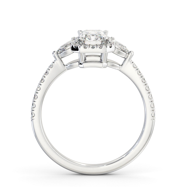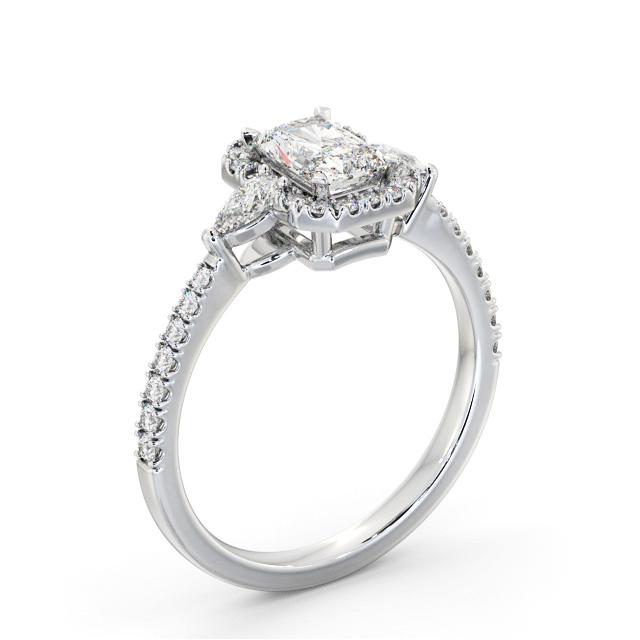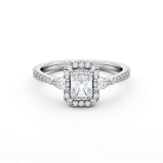 Aries diamond engagement ring with a halo Platinum setting. Truly impressive, this exquisite ring features a radiant shaped centre diamond encircled by a halo of small round diamonds and a pear shaped diamond on each side along with a round diamond accented band. Smaller diamonds will be of VS1 Clarity and F Colour as standard. This ring is available in a range of metal options and your choice of natural or lab grown diamonds. We offer a free design service for any customised changes that you may require.