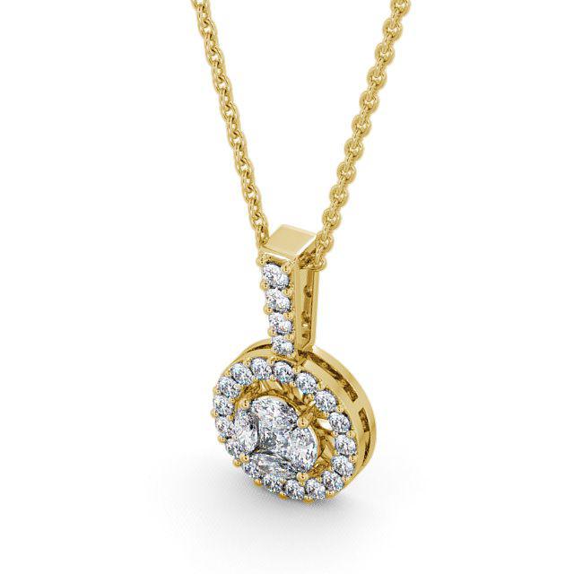 Kamea halo 0.90 Carat diamond pendant in 9K Yellow Gold. This smart and stylish pendant features a cluster of shimmering princess and marquise shaped diamonds at its centre. A halo of smaller round diamonds wraps the centre cluster in a sparkling embrace. This pendant is available in a range of metal and chain options with your choice of natural or lab grown diamonds. We offer a free design service for any customised changes that you may require.