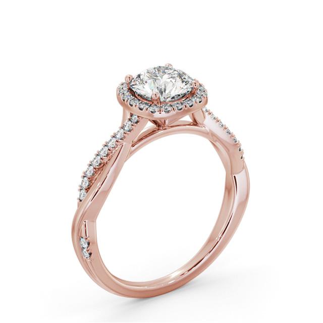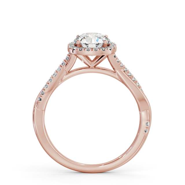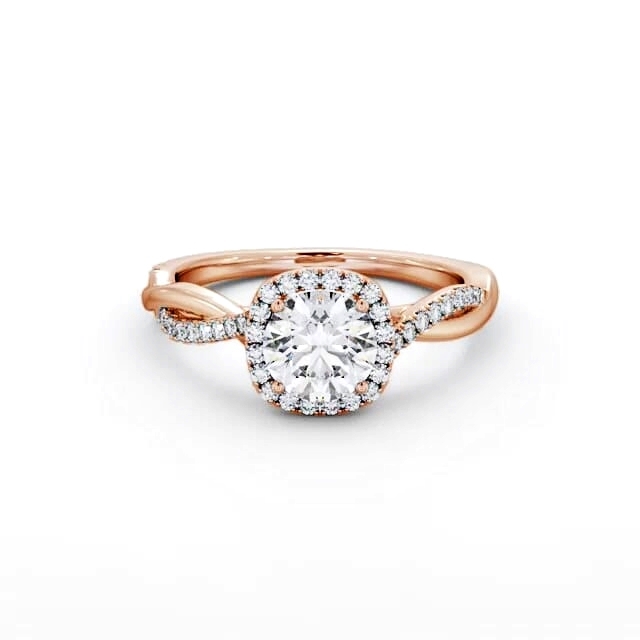 Elianna diamond engagement ring with a halo 18K Rose Gold setting. A contemporary twist on a traditional silhouette, a large round shaped diamond at the centre is enhanced by a halo of small round diamonds that trail down both sides of the twisted band. Smaller diamonds will be of VS1 Clarity and F Colour as standard. This ring is available in a range of metal options and your choice of natural or lab grown diamonds. We offer a free design service for any customised changes that you may require.