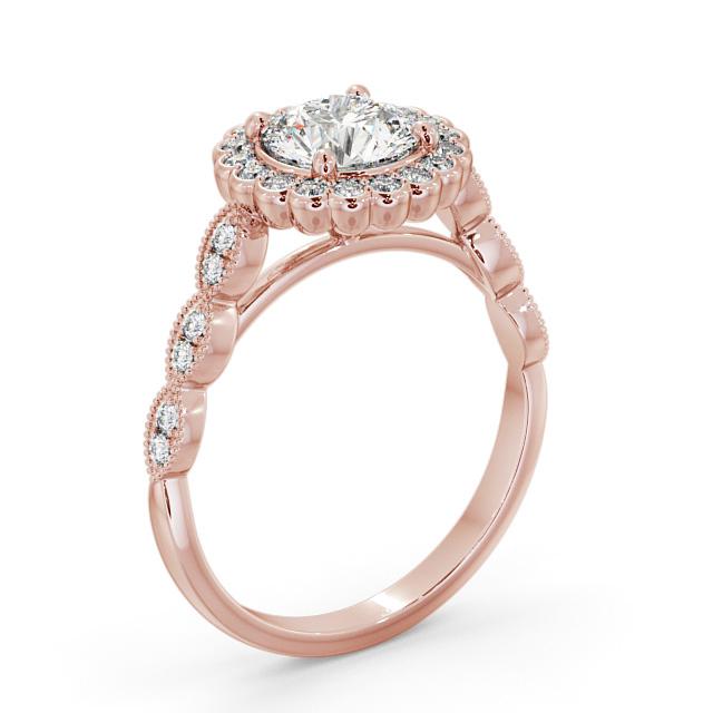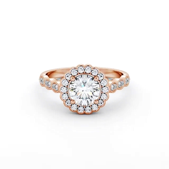 Ivanna diamond engagement ring with a halo 18K Rose Gold setting. An artful floral diamond halo blossoms around a spectacular round centre diamond in this exquisite engagement ring. Additional round diamonds are placed on either side of the milgrain accented marquise design shoulders. Smaller diamonds will be of VS1 Clarity and F Colour as standard. This ring is available in a range of metal options and your choice of natural or lab grown diamonds. We offer a free design service for any customised changes that you may require.