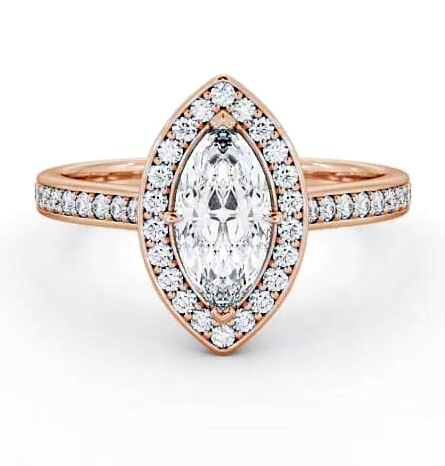 Salina diamond engagement ring with a halo 18K Rose Gold setting. A large round shaped centre diamond is flanked by glittering small round diamonds, and additional round diamonds adorn each side of the split shoulders in this enchanting engagement ring. Smaller diamonds will be of VS1 Clarity and F Colour as standard. This ring is available in a range of metal options and your choice of natural or lab grown diamonds. We offer a free design service for any customised changes that you may require.