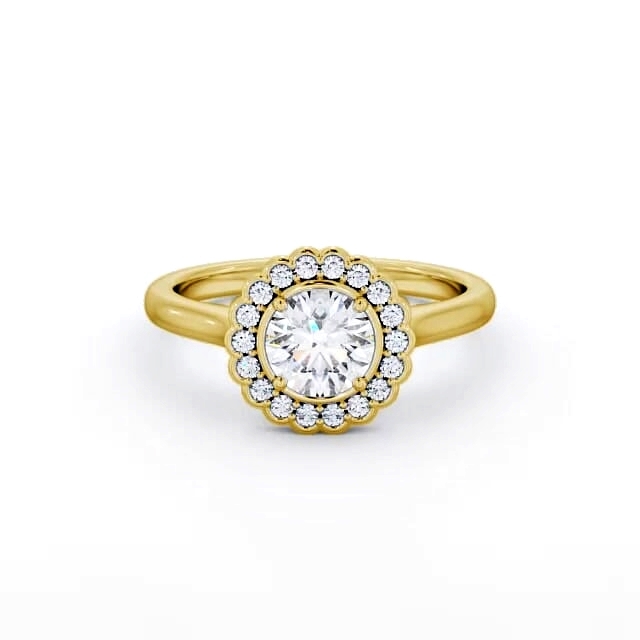 Alexandra diamond engagement ring with a halo 18K Yellow Gold setting. With a timeless look this distinctive and beautiful ring boasts a floral halo of small round diamonds wrapping the centre round diamond. Smaller diamonds will be of VS1 Clarity and F Colour as standard. This ring is available in a range of metal options and your choice of natural or lab grown diamonds. We offer a free design service for any customised changes that you may require.