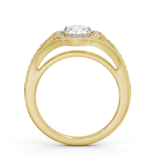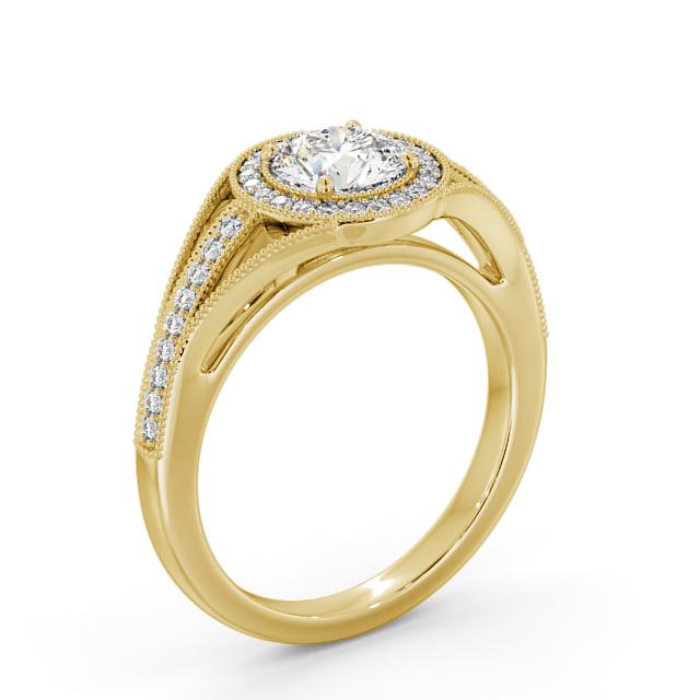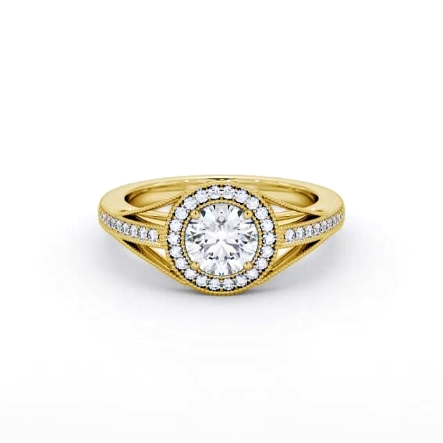 Camari diamond engagement ring with a halo 18K Yellow Gold setting. An intricate halo of milgrain accented small round diamonds embrace and accentuate the centre round diamond in this gorgeous ring. Additional small round diamond lined shoulders adds extra charm. Smaller diamonds will be of VS1 Clarity and F Colour as standard. This ring is available in a range of metal options and your choice of natural or lab grown diamonds. We offer a free design service for any customised changes that you may require.