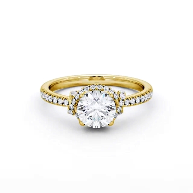 Crosby diamond engagement ring with a halo 18K Yellow Gold setting. A shimmering halo of small round diamonds surrounds a single round shaped centre diamond in this elegant engagement ring. Additional round diamonds flows on either side of the shoulders. Smaller diamonds will be of VS1 Clarity and F Colour as standard. This ring is available in a range of metal options and your choice of natural or lab grown diamonds. We offer a free design service for any customised changes that you may require.