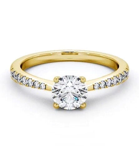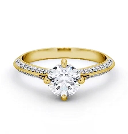 Indira diamond engagement ring with a halo 18K Yellow Gold setting. Traditional halo style ring with a touch of modern flair, a beautiful swirl of small round diamonds create the perfect halo for a round shaped centre diamond. Smaller diamonds will be of VS1 Clarity and F Colour as standard. This ring is available in a range of metal options and your choice of natural or lab grown diamonds. We offer a free design service for any customised changes that you may require.