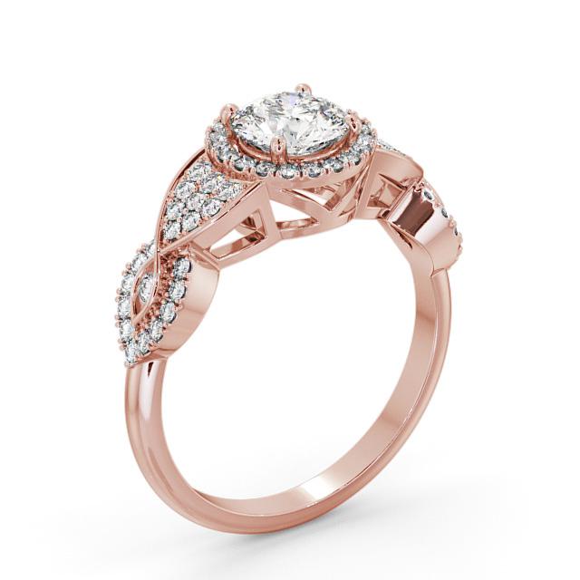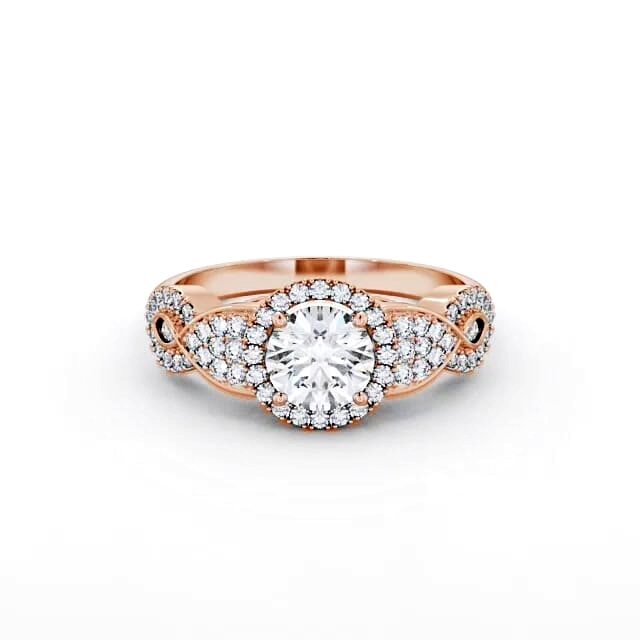 Raigan diamond engagement ring with a halo 9K Rose Gold setting. A centre round diamond at top is haloed by small round diamonds, and the twisted shoulders of the engagement ring is filled with additional round diamonds for an eye-catching allure. Smaller diamonds will be of VS1 Clarity and F Colour as standard. This ring is available in a range of metal options and your choice of natural or lab grown diamonds. We offer a free design service for any customised changes that you may require.